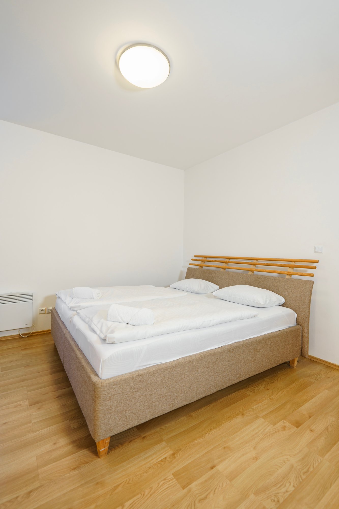 Prostorný pokoj pro rodiny nebo skupiny, vybaven manželskou postelí a palandou.